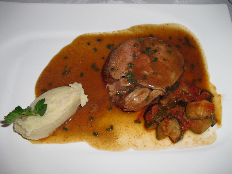 メインは子羊、ジャガイモのピューレのオリーブ風味とラタトゥイユ添え。