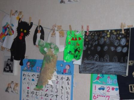 右から、北極の絵、モンスタ-、ワニのお面、ペンギン、狼、アフリカの地図。